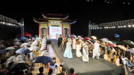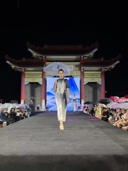9月15日晚,初秋的黄山南麓,细雨霏霏,一场名为“古韵国风荟佳丽迎客松前赞非遗”的时尚发布会在黄山风景区南大门举行。