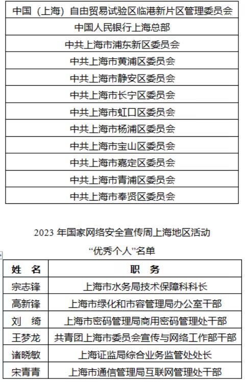 闭幕式上,对2023年国家网络安全宣传周上海地区活动18家优秀单位、18名优秀个人、20个网络安全宣传优秀典型案例进行了表彰,并宣布普陀区成为2024年国家网络安全宣传周上海地区活动的主办区。