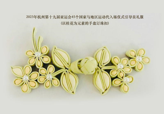 引导员服饰上另一个亮点是盘扣,名为“金桂扣”。它同样选用桂花为元素,用绸缎为面料,造型立体、饱满,叶子和花朵交错,看似对称,又非完全对称,专业上叫“等量不同形”。更别致的是,每一朵花中间还镶嵌了白色珍珠。这几粒珍珠远看并不显眼,但开幕式上在灯光照射下,以及特写镜头扫过时,便会十分亮眼。这样一个盘扣,工艺极其复杂,一个熟练的师傅一天只能盘两个。