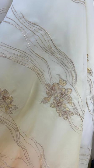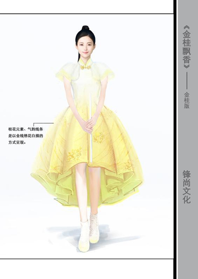 既然名为“金桂飘香”,礼服裙上一定少不了桂花。潘健华告诉记者,这桂花并不是像寻常服饰上那样整齐排列,而是以无数根线条构成桂花的形象表征,不对称地散布在裙摆上,同时还有多条不规则的纹样向上散开。刺绣采用“手推绣”“虚针绣”等技法,完全用手工一针一线绣上去,精益求精。尽管裙子上的纹样设计是非对称、不规则的,但40多套礼服裙则必须是一模一样的。为此,30个绣工整整绣了25天才全部完成!