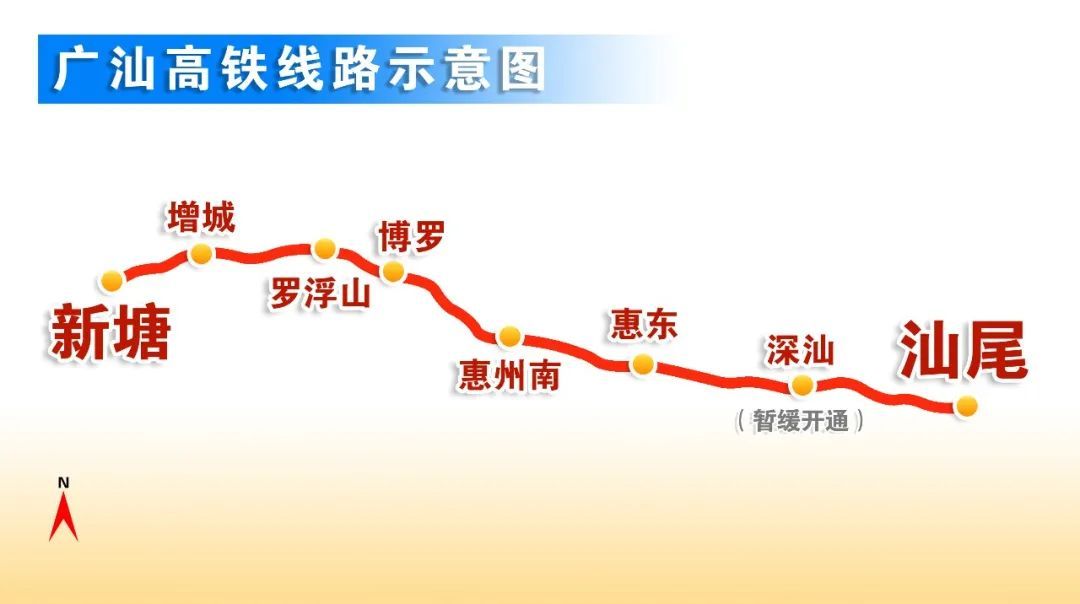 广汕高铁线路全长约200公里,设计时速350公里,自广州新塘站引出终到汕尾站。全线设新塘、增城、罗浮山、博罗、惠州南、惠东、深汕、汕尾8座车站。