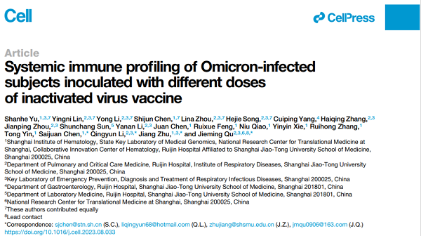 9月27日,上海交通大学医学院附属瑞金医院瞿介明教授、诸江教授、李庆云教授和陈赛娟院士合作团队在Cell杂志发表题为“Systemic immune profiling of Omicron-infected subjects inoculated with different doses of inactivated virus vaccine”的研究论文,首次系统性地描述新冠病毒灭活疫苗接种对奥密克戎感染者免疫反应的影响,揭示了3次增强剂灭活疫苗通过诱导 “训练天然免疫”促进单核细胞的活化和成熟,从而发挥强有力抗病毒作用的分子机制。