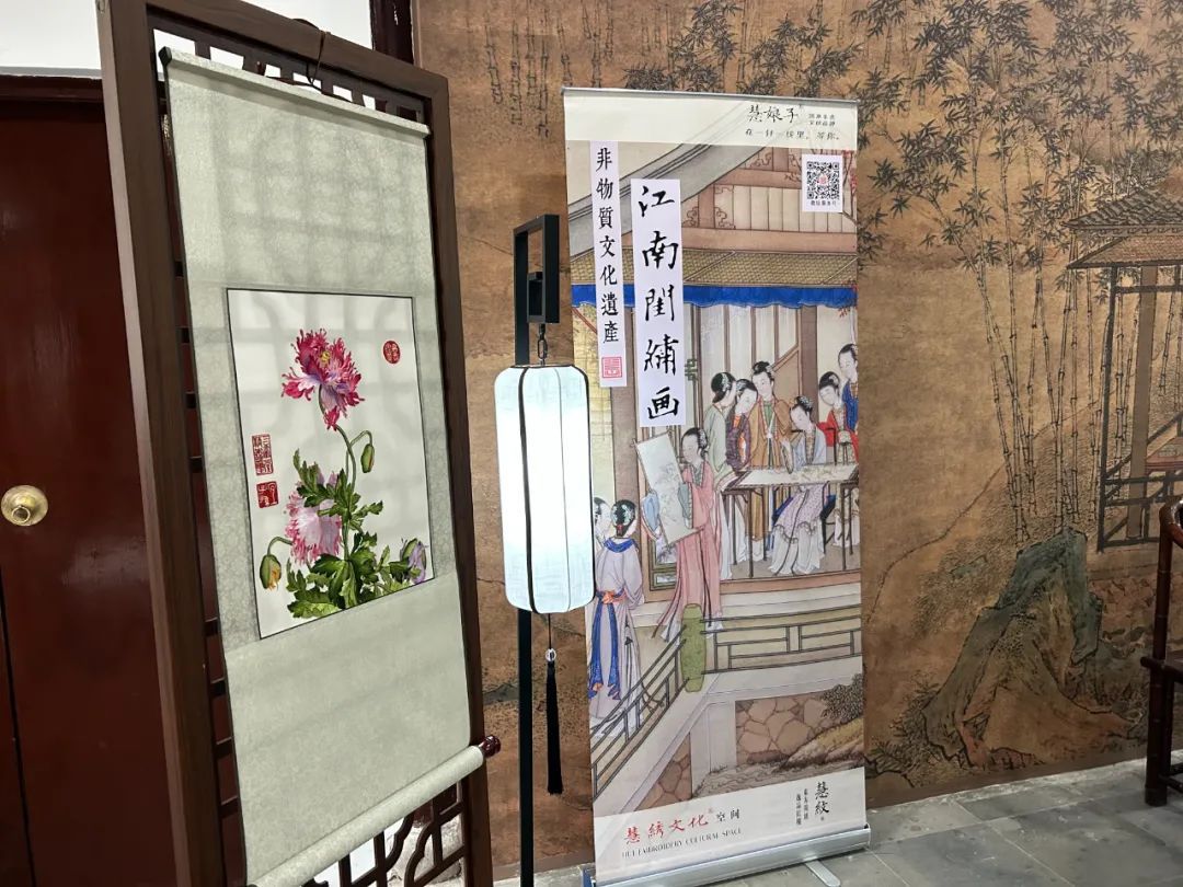 “江南闺绣画源起宋代宫廷,是一种以桑蚕丝绣绘传统书画的闺阁艺术。明代《蕉窗九录》记载……”江南闺绣画项目主要传承人范冬梅用一个个小故事将江南闺绣画的历史渊源、艺术特征娓娓道来。一幅幅色泽清雅、古朴传神的绣绘作品引得大家目不转睛,跃跃欲试。