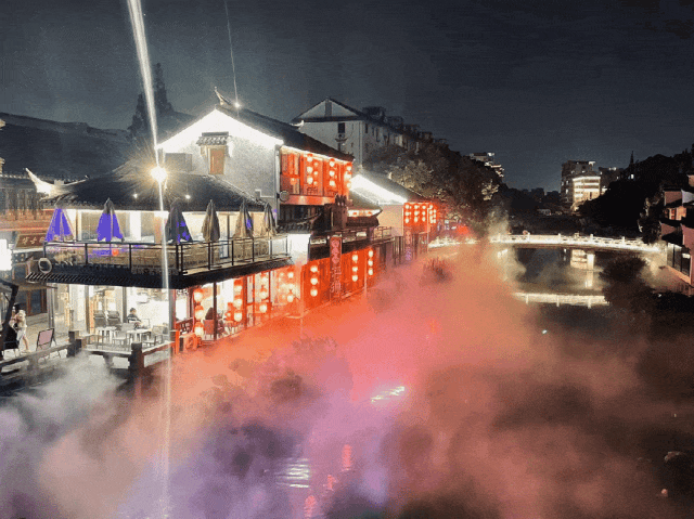 该氛围灯光的设计结合七宝古镇的建筑特点、运用声、光、电、水、雾等手法,打造了观赏式和沉浸式体验的灯光氛围,而在浦汇塘桥桥梁下方设置的瀑布水帘,运用投影的方式展现浦汇塘特有的元素,如荷塘月色、锦鲤、皮影戏、烟雨江南等,展现七宝古镇特色。