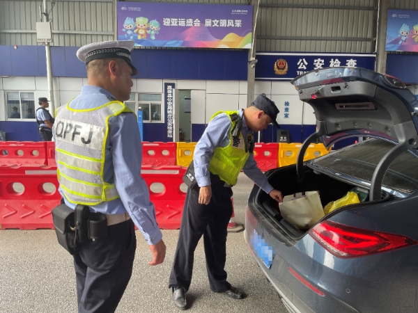蒸俞检查站地处上海青浦、浙江嘉善交界处,一块写有“联动长三角、共画同心圆、携手保平安”的蓝底红字标牌格外醒目。为保障亚运盛会顺利召开,自9月8日起,浙江嘉善公安从姚庄、西塘等邻近派出所抽调50余名警辅力量,与青浦公安分局蒸淀派出所在蒸俞检查站开展“一点两检”联合查控。由青浦公安负责入沪方向,嘉善公安负责入浙方向的车辆查控。