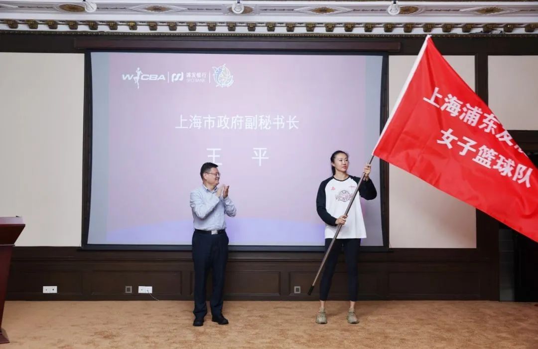 10月17日,上海浦东发展银行女子篮球队合作签约暨出征仪式在体育大厦举行,上海女篮姑娘们与浦发银行强强联手,共同开启新赛季征程。上海市政府副秘书长王平向球队队长黄靖授队旗 。上海市体育局党组书记、局长徐彬致辞。浦发银行党委书记张为忠向主教练展淑萍颁发聘书、向球员代表张芷婷授新赛季比赛服。市竞技体育训练管理中心党委书记王海威主持会议。浦发银行党委副书记赵万兵致辞。市竞技体育训练管理中心主任王励勤与浦发银行上海分行行长汪素南签署战略合作协议。