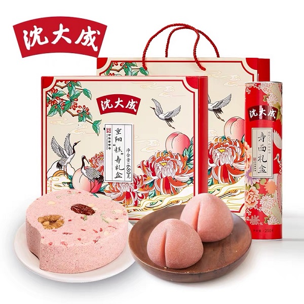 记者看到,今年除了经典款重阳糕,沈大成还推出了五仁、黑芝麻核桃、黄油椰蓉多个口味,以满足老食客与年轻人的多元饮食需求。而在电商平台上,则有刚刚入选了“2023 上海伴手礼”的“重阳糕寿”礼盒在售。其包装的灵感源自汉代《西京杂记》,有着满满的国潮风,礼盒内则是一块寿桃形状的重阳糕、两只圆胖的寿桃及一盒寿面,成为不少年轻人孝敬父母的选择。