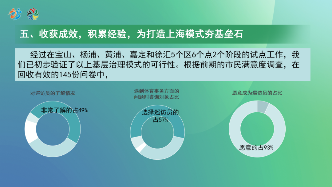 根据满意度调查,上海市民对社会体育巡访员开展的各类工作满意的占77%,市民愿意成为社会体育巡访员的占比更是高达93%。