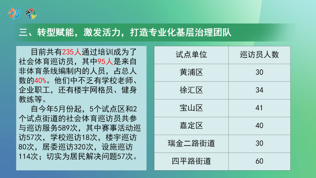 自今年5月份起,5个试点区和2个试点街道的社会体育巡访员共参与巡访服务589次,其中赛事活动巡访57次,学校巡访18次,楼宇巡访80次,居委巡访320次,设施巡访114次;切实为居民解决问题57次。