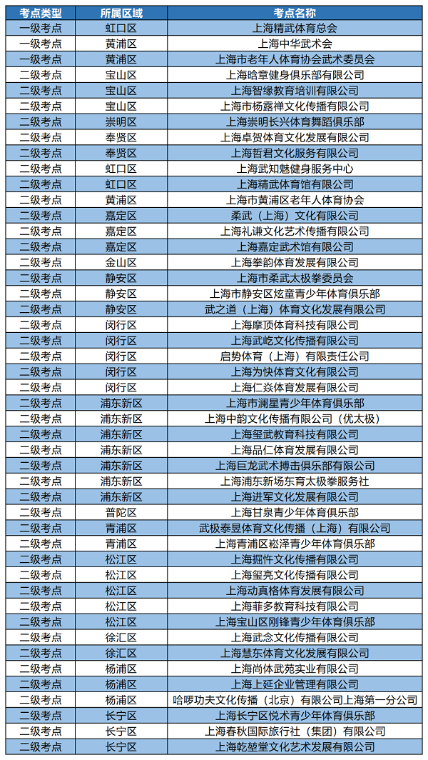 图说:本市全部段位考试点具体名单 来源/上海体育(下同)