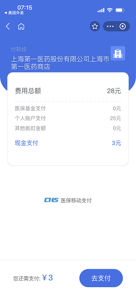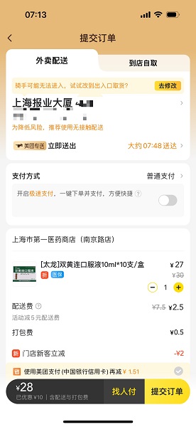 今早7时13分,在美团外卖App“看病买药”专区,记者进入带有“医保”字样的上海市第一医药商店(南京路店),看到有一些药物带有“医保”字样,如芬必得布洛芬缓释胶囊、云南白药气雾剂、太龙双黄连口服液等。记者点击购买太龙双黄连口服液,选择“立即送出”,商品页面显示原价30元,有9折优惠(限2份),优惠价27元,配送费原价7.5元,因活动减5元,打包费0.5元,门店新客立减2元,记者未选美团红包,最终价格28元,医保个人账户支付25元,现金支付3元。