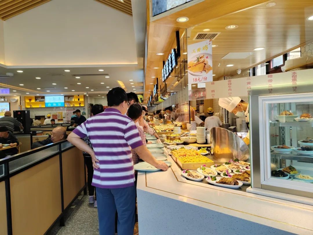 以睦邻小厨熊猫饭堂为例,身为一家“社区大食堂”,它在装潢上主打时下流行的“原木风”。明亮温馨的灯光下,摆着简洁舒适的浅木色桌椅,让人用餐时也心情愉快。柜台内分为“美味小炒”“香醇干锅”“营养蒸菜”“精品主打菜”几个区域,隔着半扇玻璃,可见油亮的红烧肉、清新的毛豆香干、金灿灿的炒蛋……居民们人手一只托盘,选菜、装盘、付款,就能吃上热腾腾的饭菜,吃不完的还可打包回家。