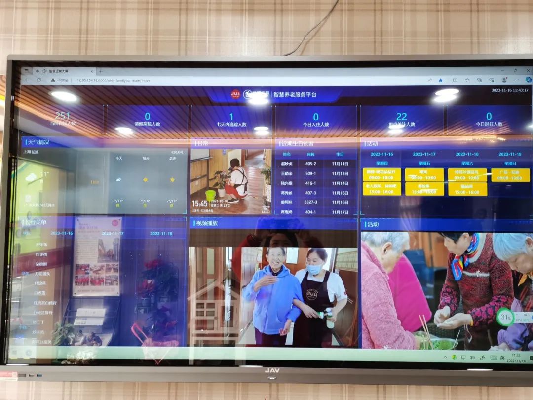 在红日养老院入口处,一台数字可视化大屏成为了观览全院的“窗口”。“当日在线人数251人”“请假离院人数0人”“重点关注人数22人”“今日长者菜单:白米饭、红枣粥、豆豉蒸排骨……”不同模块分区清晰显示了不同时间段内的院内人员情况和供给服务,一旁的活动栏还标注了近期将开展的老年集体活动,欢迎住养老人参加。