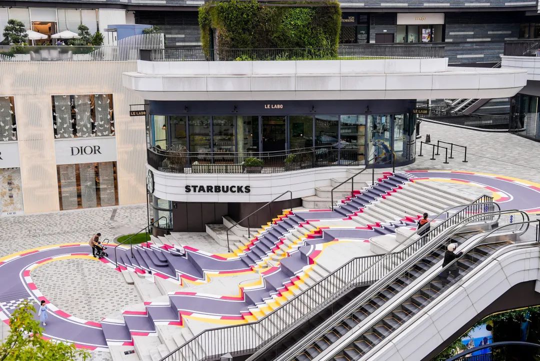 在前滩太古里中央广场,法国艺术家Laurent Perbos打造的巨幅作品《赛道Race Car Track》,将标志性的视觉错位效果与大台阶空间结构巧妙融合,旨在为观众创造一个游戏的场域,赋予商业空间更多趣味性和参与感。