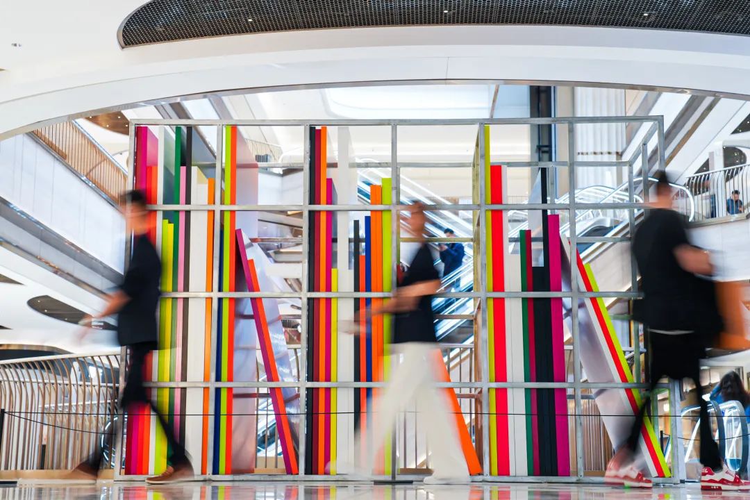 商场1层的装置作品《阁架》来自艺术家丁乙,展示了艺术家工作室阁架的日常场景,作品周边的光影、行走的人,都对荧光色的作品产生反射,装置与周遭关联成的状态,形成了一个立体的雕塑。