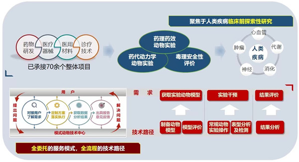 出具“定制化”的综合解决方案,实现一站式、全流程服务是模式动物技术中心的宗旨。模式动物技术中心依托于实验动物中心,由转化医学国家重大科技基础设施与分析测试中心共建,以承接整体项目为服务导向,紧密对接用户需求,以相关动物实验技术、平台仪器设备为支撑,出具实验项目综合解决方案。