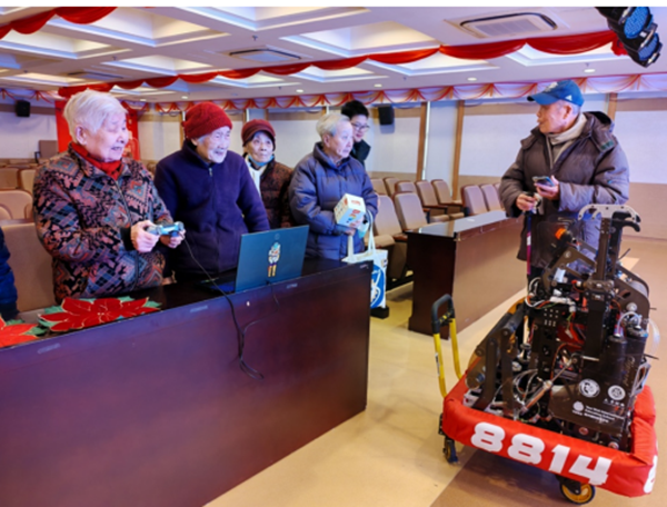 在孩子们的指导下,93岁的冯阿姨拿起了游戏手柄,现场操控投篮机器人,玩得不亦乐乎。看着眼前的机器人和“8814”机器人团队,老人们笑得合不拢嘴,纷纷感慨:“太优秀了,国家未来的发展就靠你们啦。”