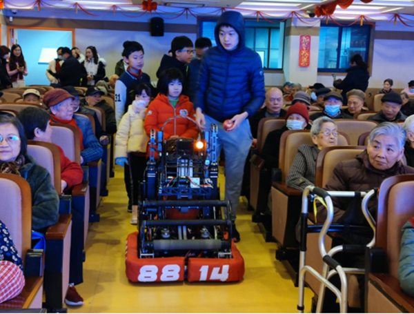 12月24日上午,上海中学生机器人联队带着他们研发的机器人“8814”,来到杨浦区社会福利院。这台底盘为边长约四五十厘米正方形、高约七八十厘米的机器人,机械臂上架着一个果篮,里面放满了红彤彤的苹果,穿梭在多功能厅的走道里,给老人们送上红苹果,老人们对这个新鲜玩意儿充满了好奇。