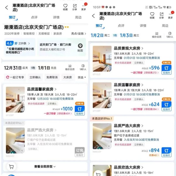 另据上海宝格丽酒店官方小程序显示,31日晚标价6888元的“高空露台酒吧新年夜礼遇”套餐已经售罄。详情页显示,该套餐包括海博瑞鲟鱼子酱(30克)、手工现切伊比利亚小何赛火腿36个月(80克)、白葡萄酒煮文蛤配番茄一份、12只2号玫瑰粉钻生蚝、水果盘一个,以及750毫升的唐培里侬香槟一瓶。此外,热门景区附近的酒店预订量也较为火爆,价格也有所上涨。例如北京天安门附近的潮漫酒店,中新经纬29日午间查询发现,31日晚也仅剩一间售价为1010元的品质温馨家庭房,其余房型均已售罄。1月2日,该酒店价格有所回落,上述房型降为624元一晚,其余房型也均可预定。