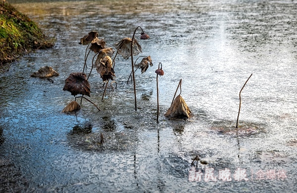 图说:寒潮天气,金山区朱泾镇花开海上生态园内的小河结冰 新民晚报记者 陶磊 摄