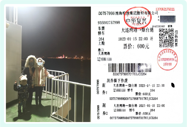 图说:李女士乘船带孩子回烟台老家过年,并扫描交通收据留作纪念