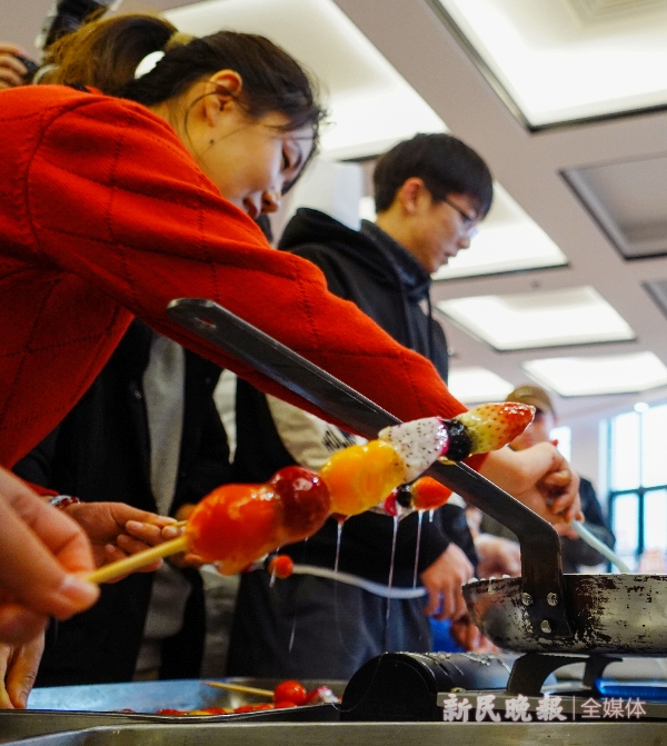 图说:上海建桥学院留校学生动手制作糖葫芦 陶磊 摄