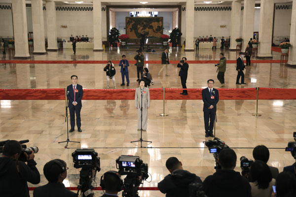 图说:3月7日,全国政协十四届二次会议第二场“委员通道”集体采访活动举行 新华社记者 金立旺/摄