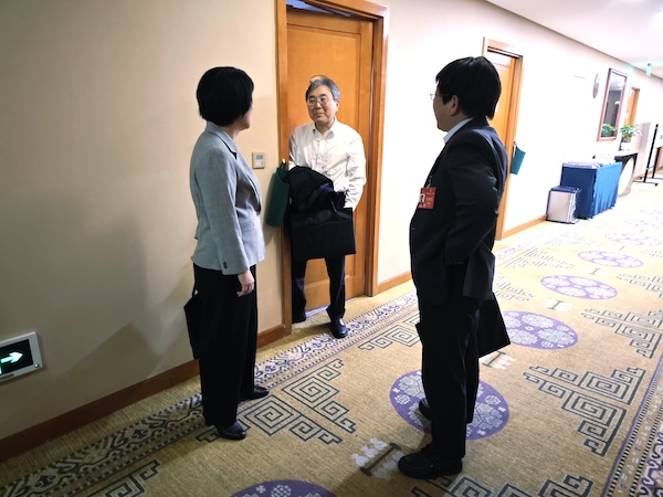走出会场,讨论还在继续。你看,梅兵代表(左)、印杰代表(中)、黄勇平代表(右),边走边说,意犹未尽。