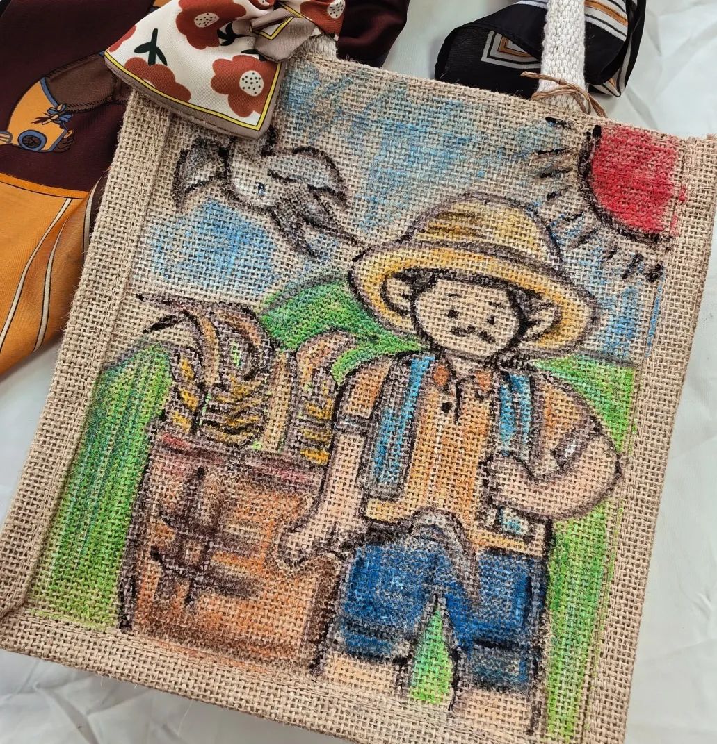 学生金懿和她的导师王译若在布袋上画了农民和麦田,袁隆平的“禾下乘凉梦”跃然布上。王老师说:“袁隆平把功勋写在祖国大地上。我和学生共同完成这个作品,就是鼓励他们学习科学家脚踏实地的精神和为民造福的爱国情怀。”