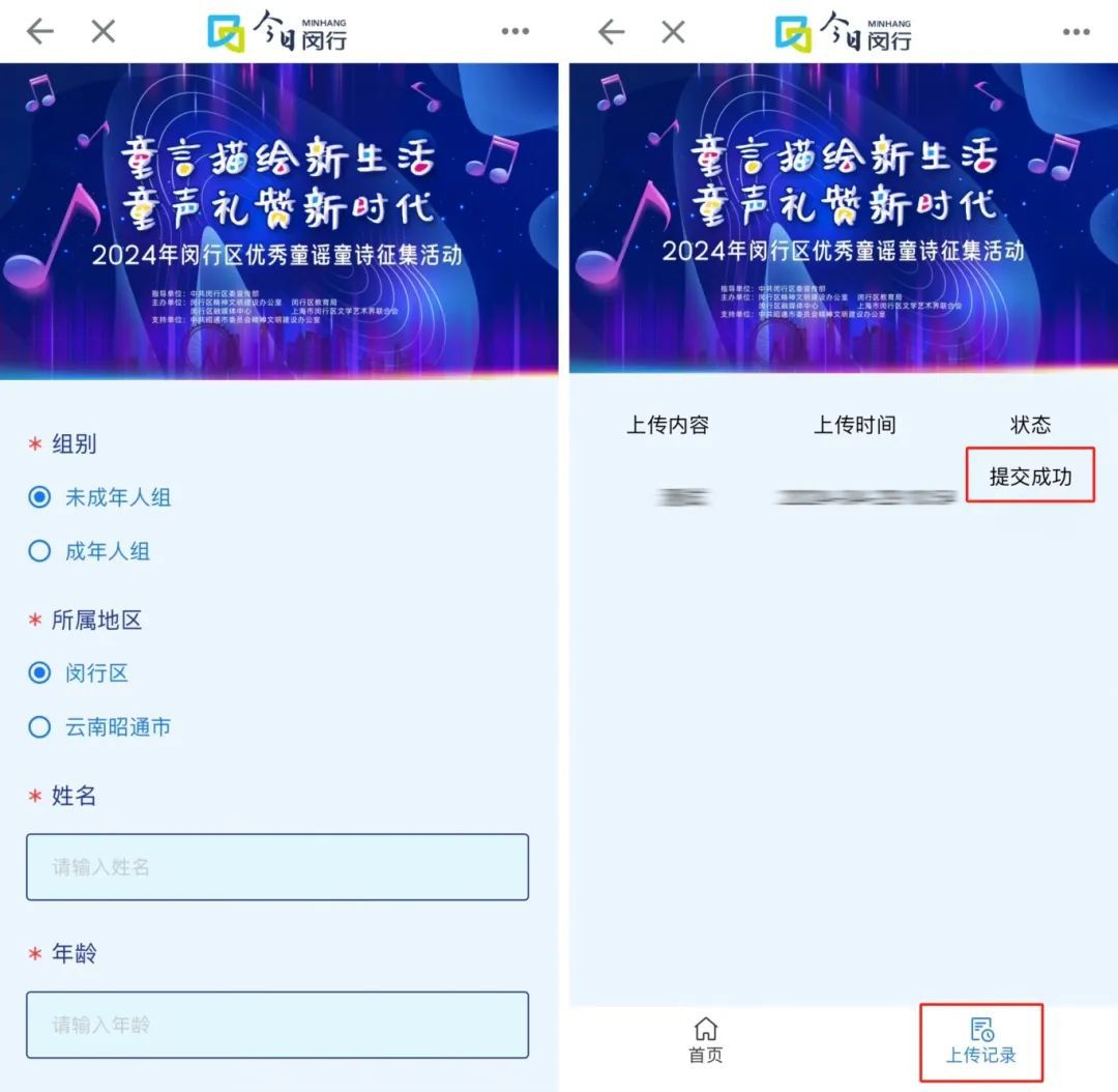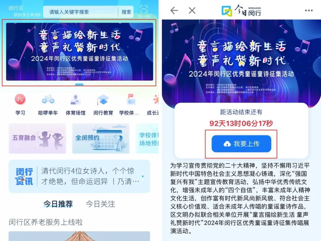 2.在“今日闵行”APP首页banner位滑动找到优秀童谣童诗征集活动专题页,点击进入报名页。