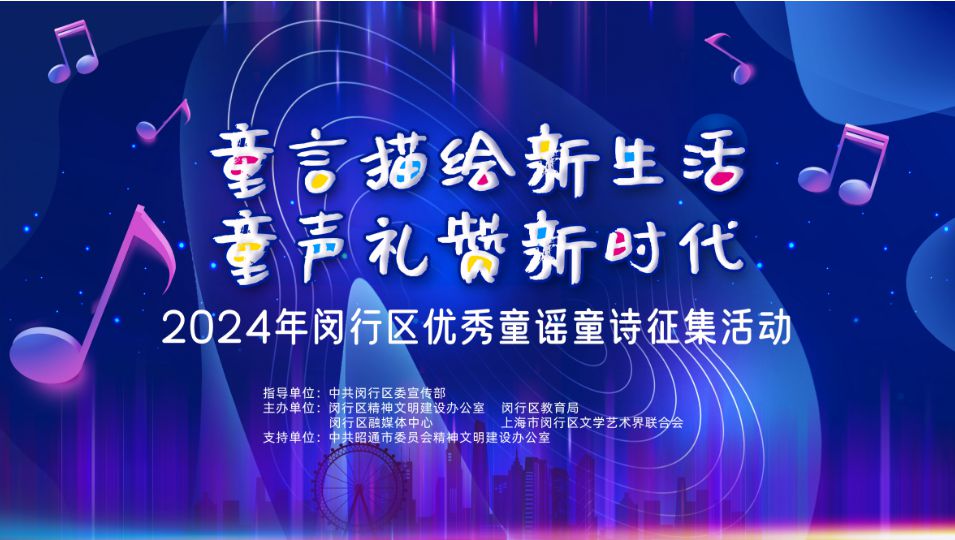 为学习宣传贯彻党的二十大精神,坚持不懈用习近平新时代中国特色社会主义思想凝心铸魂,深化“强国复兴有我”主题宣传教育活动,弘扬中华优秀传统文化,增强未成年人的“四个自信”,丰富未成年人精神文化生活,创作富有时代新风尚新风貌、符合社会主义核心价值观、适合未成年人传唱的童谣童诗作品,闵行区开展“童言描绘新生活 童声礼赞新时代”2024年闵行区优秀童谣童诗征集传唱展演活动。
