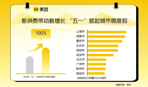 热辣滚烫的数据背后,折射出假期玩乐消费的新趋势与新亮点——“城市微度假”悄然兴起,一站式休闲体验受热捧,多次卡等高质价比消费方式流行。美团数据显示,“五一”假期,休闲玩乐订单量同比翻倍增长,上海、成都、重庆、北京、深圳、武汉、长沙、广州、杭州、西安的玩乐消费最旺。