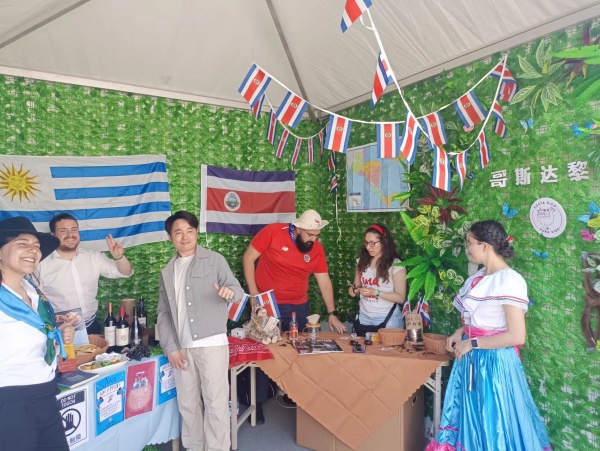 各国学生代表身穿本国传统服装入场,为国际文化节涂抹上缤纷的多元文化底色。本次国际文化风情展共设置了涵盖36个国家的展台,展示内容包括各国美食、精美服饰、建筑风格、工艺展品等。在上大学习的国际学生们纷纷向大家介绍本国的特色文化。为增加活动的互动性与趣味性,不少展台还设计了游戏问答环节,增进观众对异国文化的了解。