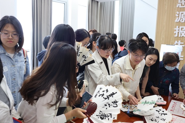 思源影院门外人头攒动,师生们在展台前仔细欣赏着“清风扇”廉洁文化作品,各自挑选一把心仪的扇子,拿着扇子缓步走入思源影院。