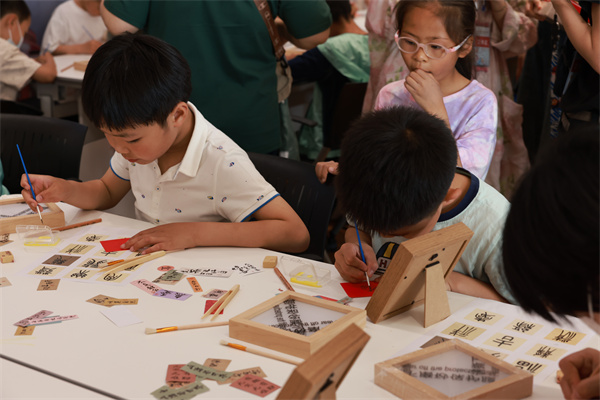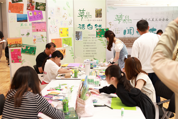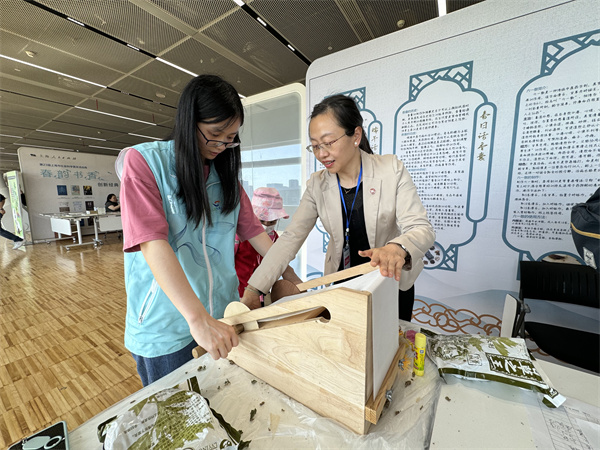现场,丰富多彩的互动项目吸引市民们排队体验。“肚子抵住机器,一边向下拉,一边转动手腕。”上海中医药博物馆“本草撷英”手作体验摊位前,一台木制的卷艾机非常吸睛,市民可以亲手将艾绒和桑皮纸放入卷艾机中,体验手工卷制艾条。上海越剧团的戏服试穿活动摊位被戏曲爱好者团团围住。“我以前一直没有get到戏曲的美,穿上戏服,感觉自己血脉觉醒了!”一个姑娘兴奋地举着手机拍照。“江南风韵——古建筑文化展示与版画拓印”区域,上海工艺美术学院的老师和同学们带来了古建筑修缮的材料和图纸,观众可以通过显微镜细致观察彩画矿物质。在上海写作学会和江东书院共同带来的“草木自然”诗词之美互动体验摊位,小朋友们用树叶标本,诗词卡片和自己的文字创作出一幅幅拼贴画,“斑驳的,五彩的,明亮的,秋声承载着俺滴白日梦”,一位小朋友现场写下了这样的文字。