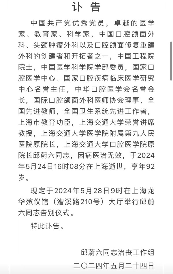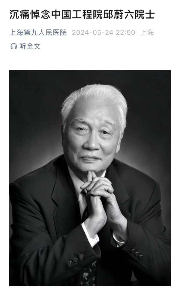 今天晚上,上海交通大学医学院附属第九人民医院公众号发文,中国口腔颌面外科、头颈肿瘤外科以及口腔颌面修复重建外科的创建者和开拓者之一,中国工程院院士,上海交通大学医学院附属第九人民医院原院长,上海交通大学口腔医学院原院长邱蔚六因病医治无效于今天(24日)下午在上海逝世,享年92岁。