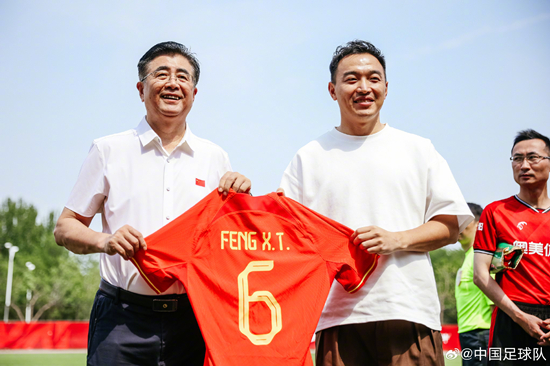 中国足协主席宋凯在国足训练场边向冯潇霆送上了印有他名字和号码的国家队比赛服
