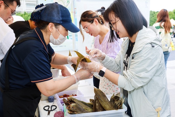 市集上最热闹的当属“粽情端午”展位。青豆腊肉粽、蛋黄鲜肉粽、清油火锅粽等多种口味任“文化体验官”们品尝。现场,学生还可以自己体验包粽子,在实践中感受中华传统饮食文化。一叠、一折、一填、一包,看似简单的步骤,实际操作起来却有一定难度。最后看着手中的粽子小巧玲珑又结实饱满,很有成就感。活动当日也是高考的第一天,大家也为正在高考的学子送上了“一举高粽”的美好祝福。