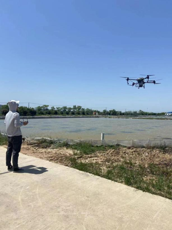 图说:周旋操纵无人机投喂饲料