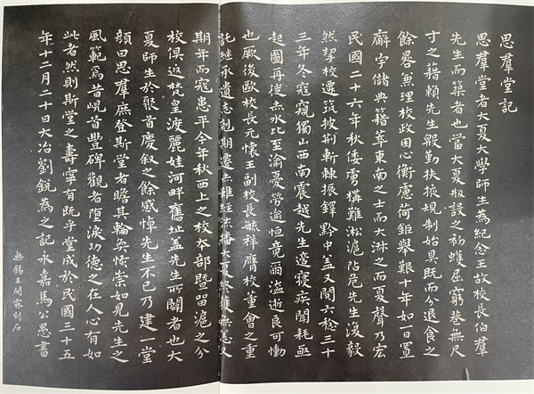 马公愚先生曾为大夏大学多座建筑的落成与重大庆典书写铭文,其中包括现在仍在普陀校区的思群堂,落成时由马公愚先生书写《思群堂记》,还有《大夏大学体育馆落成颂》《大夏大学校舍第一座奠基记》《大夏旗杆铭》《大夏大学十周年纪念颂》等等,这些铭文的书写都与大夏大学的历史发展紧密相连。