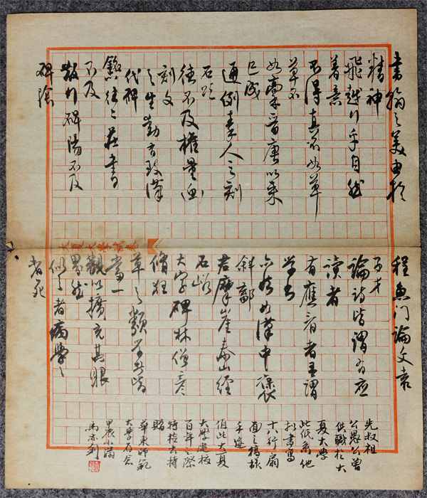 展览中另有马公愚先生拟书写十八行扇面样式的论书手稿,稿笺上有大夏印记,书写风格颇具二王法度,文辞体现了马公愚先生的书法观。通过对马公愚先生年表、诸多校史资料的梳理,可以清晰地看到这位大夏先贤与大夏大学校园书法文化的紧密联系。