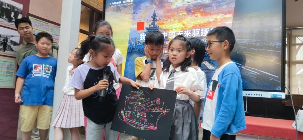 在“我心目中的驱逐舰”环节,同学们组成4个小组积极讨论,并在家长的协助下画出未来的驱逐舰,并以小组为单位,展示讲解本小组的成果。它激发孩子的创造力和想象力,更增强了他们的团队意识和和表达能力。