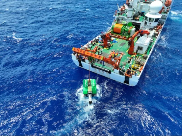 6月22日至26日,西太平洋多金属结壳与结核海区,“开拓二号”在4级海况、6级海风条件下,连续每天完成1个潜次,采矿车分别达到了1802.4米、1929.9米、1955.8米、2048.5米和4102.8米等深海海底——这是国内深海重载作业采矿车首次在4000米深海海底开展深海矿产资源试开采试验。