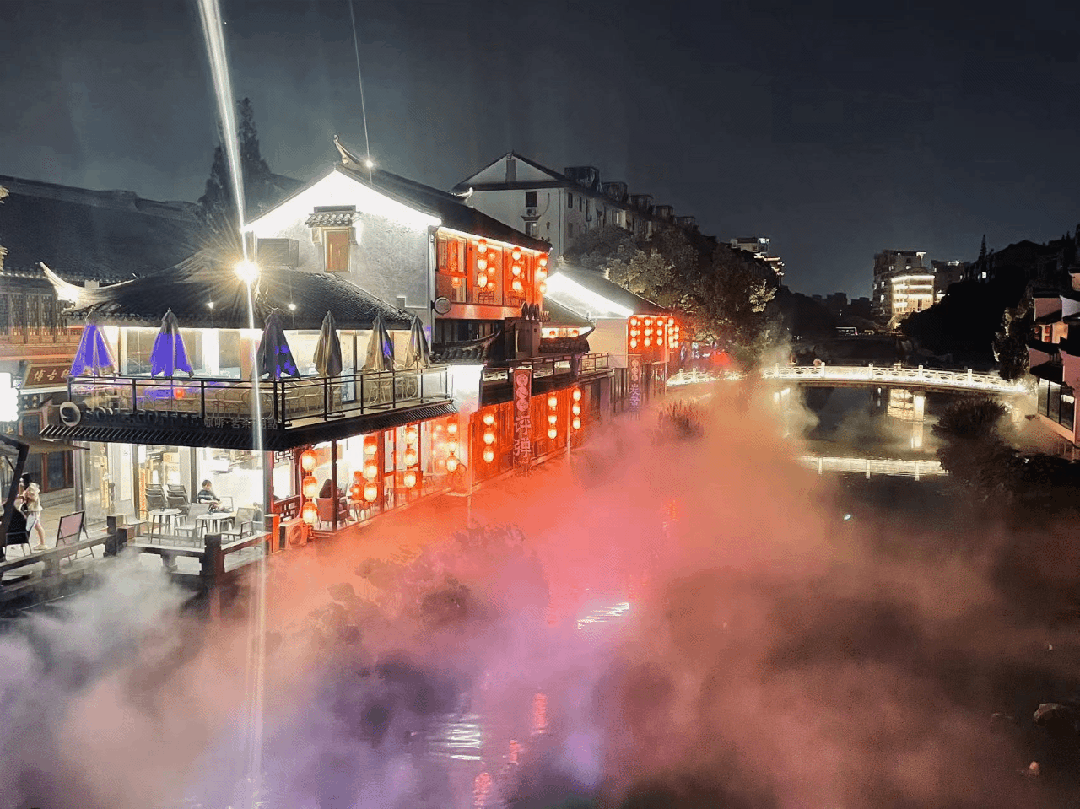 雾森系统与激光灯的加入,使得七宝古镇在流光溢彩与烟雨朦胧间自由切换,营造出一个既现代又古典的梦幻空间。特别是蒲汇塘桥下的瀑布水帘,配合投影技术,生动展现了荷塘月色、锦鲤跃龙门、皮影戏等传统文化元素,令人仿佛置身于一场视觉与文化的盛宴。