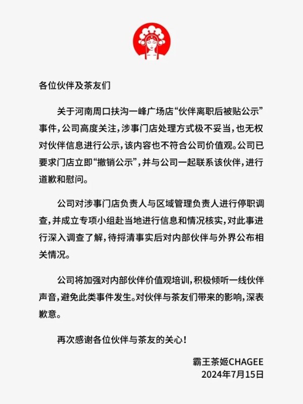 7月15日晚,霸王茶姬就“员工离职后被贴公示”一事发布情况说明,称涉事门店处理方式极不妥当,对涉事门店负责人及区域管理负责人进行停职调查。以下为全文: