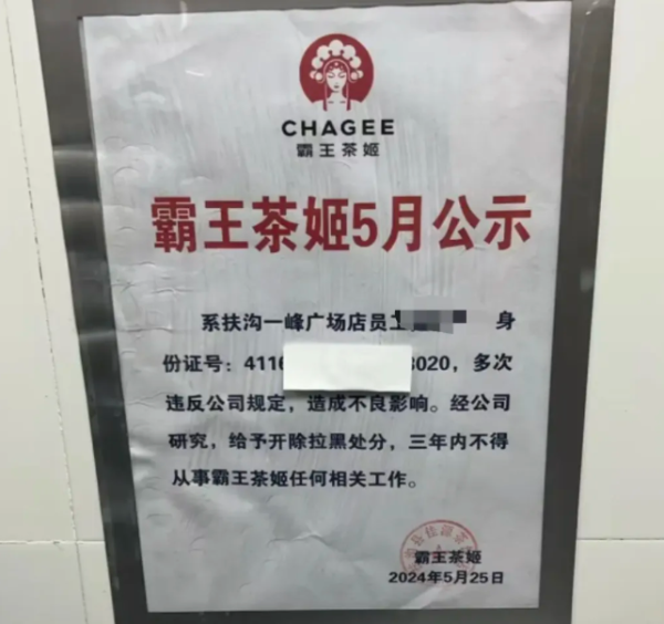 从截图中可以看到,公示上写着:扶沟一峰广场员工楚某某,多次违反公司规定,造成不良影响,经公司研究,给予开除拉黑处分,三年内不得从事霸王茶姬任何相关工作。