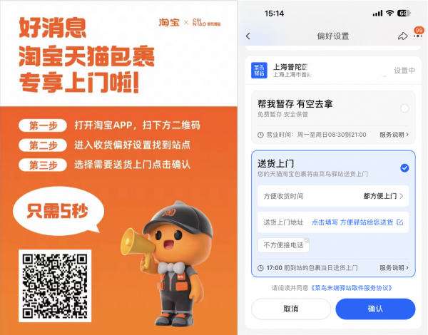 菜鸟驿站证实了这一消息:“菜鸟驿站在全国推广‘按需上门’的基础上,在上海率先升级服务,将面向上海用户提供淘宝天猫包裹‘专享上门’服务,用户只需在收货偏好里设置送货上门即可。”