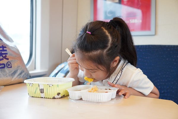 图说:一位小朋友在G8388次列车食用儿童餐 王圣凯 摄