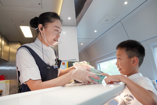 “给我一份儿童餐黑椒牛柳意面,再来一份秘制酱鸭腿饭。”7月17日,在上海虹桥至北京南的G124次列车上,旅客王女士带着7岁的儿子正在9号餐车购买盒饭。与以往列车上提供的盒饭不同,现在列车上推出了适合儿童食用的趣味餐食,让小朋友旅客拥有更多选择。