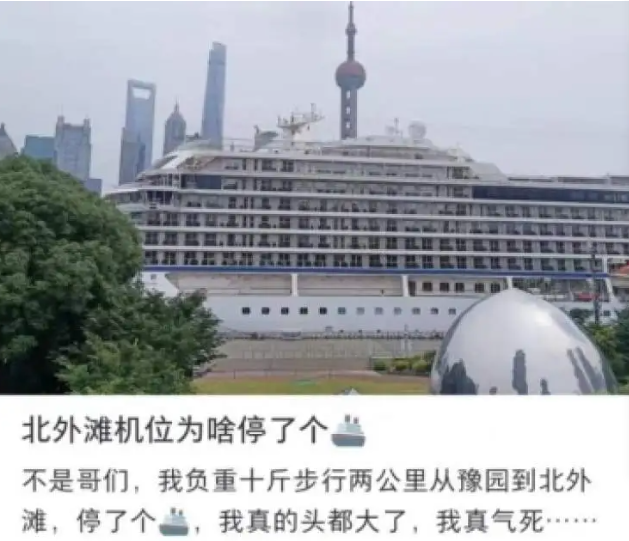 当天另一位留下遗憾的游客也发帖称:“一艘大邮轮挡得死死的,连同江边都不能靠近了。”